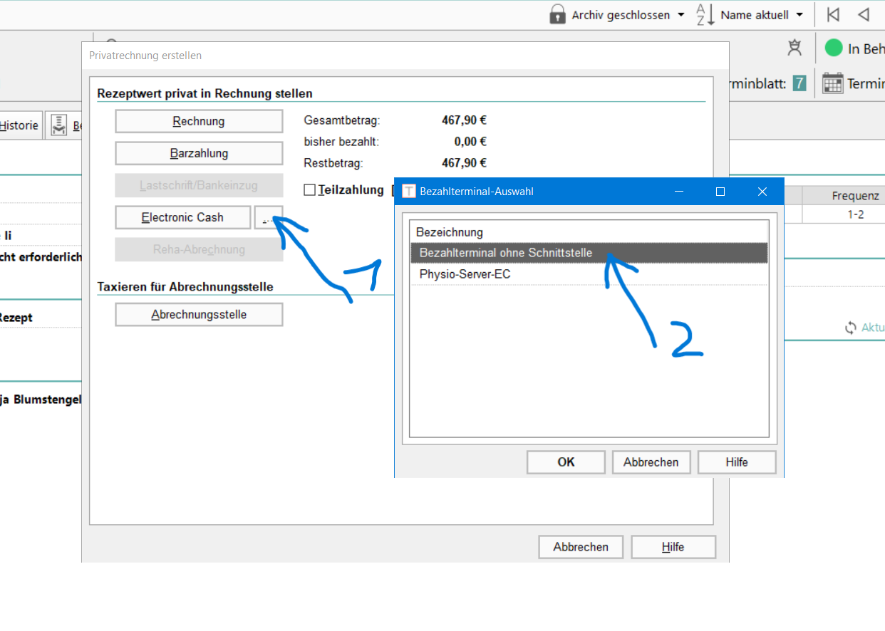 Ihr geht nochmal auf Quittung/Rechnung. Hinter EC-Zahlung findet Ihr ein Kästchen mit 3 Punkten … (siehe Screenshot). Dort drauf klicken und Bezahlterminal ohne Schnittstelle auswählen.